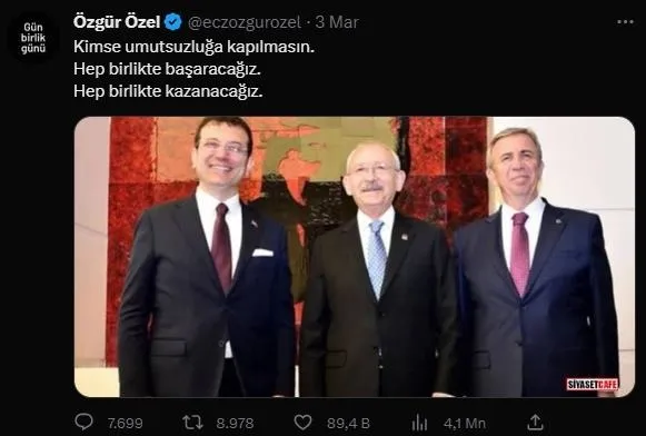 CHP Grup Başkanvekili ve Manisa Milletvekili Özgür Özel de, Ankara Büyükşehir Belediye Başkanı Mansur Yavaş, İstanbul Büyükşehir Belediye Başkanı Ekrem İmamoğlu ve Kılıçdaroğlu'nun fotoğraflarının olduğu bir görsel paylaşarak, "Kimse umutsuzluğa kapılmasın. Hep birlikte başaracağız. Hep birlikte kazanacağız." ifadelerini kullandı.