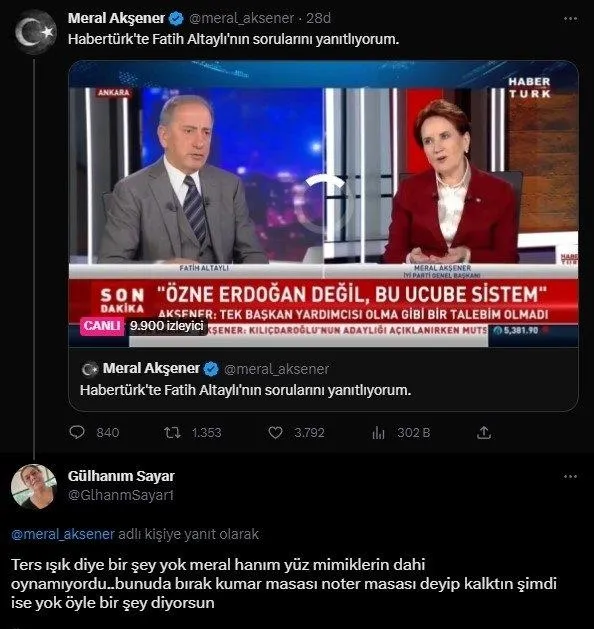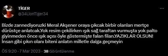 "Biz de zannediyoruz ki Meral Akşener oraya çıkcak birbir olanları mertçe dürüstçe anlatacak. Yok resim çekilirken ışık sağ taraftan vurmuş da yok palto giyinmeden önce ışık açısı öyle göstermiş de falan filan. YAZIKLAR OLSUN! İnsan gibi çıkın olanı biteni anlatın milletle dalga geçmeyin"