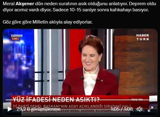 Meral Akşener'in milletle dalga geçmesine sosyal medyadan tepki yağdı. Bir sosyal medya kullanıcısı, "Meral Akşener dün neden suratının asık olduğunu anlatıyor. Deprem oldu diyor acımız vardı diyor. Sadece 10-15 saniye sonra kahkahayı basıyor. Göz göre göre Milletin aklıyla alay ediyorlar." dedi.