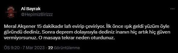 6'lı koalisyondan yaptığı zehir zemberek açıklamalar sonrası ayrılan İyi Parti Genel Başkanı Meral Akşener, koalisyona "Ekrem İmamoğlu ve Mansur Yavaş cumhurbaşkanı yardımcısı olsun" şartıyla geri dönmüştü. Toplantı sonrası istediğini tam olarak alamadığı ise yüzüne yansımış ve gündem olmuştu. Katıldığı canlı yayında, toplantı sonrasındaki asık suratıyla ilgili akılalmaz bir savunmaya imza atan Akşener, "Kemal Bey'in yaptığı konuşmaya baktığınızda tuhaf bir ışık gelmiş." dedi. Işık yalanına depremi de alet eden Akşener, "Bir de deprem oldu, kahkaha atmaya çekiniyoruz" dedi ancak gündüz saatlerinde İyi Parti Genel Merkezi'ne geldiğinde etrafa gülücükler saçıyordu. Masadan kalkmasıyla ilgili milletle dalga geçen Akşener, "Herkes bana masadan kalktı diyor ama, masa kalktı" şeklinde ifadeler kullandı.