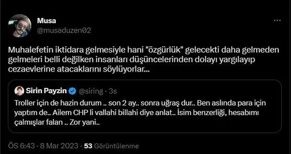 "Muhalefetin iktidara gelmesiyle hani "özgürlük" gelecekti daha gelmeden gelmeleri belli değilken insanları düşüncelerinden dolayı yargılayıp cezaevlerine atacaklarını söylüyorlar..."