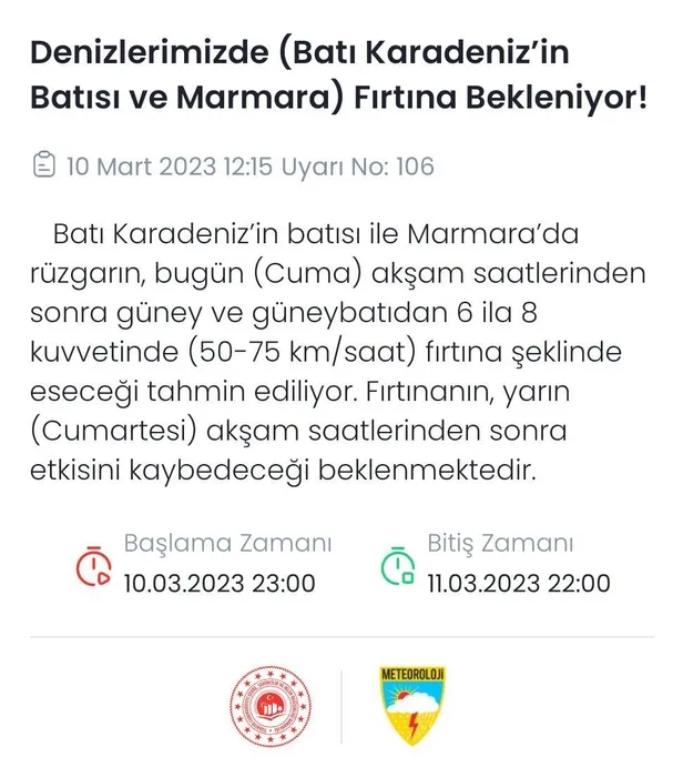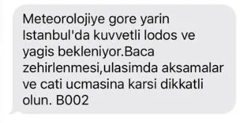 Meteoroloji Genel Müdürlüğü (MGM), Marmara Bölgesi için lodos fırtınası uyarısı yaptı. MGM İstanbul Bölge Tahmin ve Erken Uyarı Merkezi'nce yapılan açıklamada; rüzgarın; Marmara Bölgesi'nde (İstanbul, Edirne, Kırklareli, Tekirdağ, Kocaeli, Sakarya ve Yalova) yarın, güney (lodos) yönlerden fırtına (50-70 km/saat), hamleli kuvvetli fırtına (70-90 km/saat), yüksek kesimlerde hamleli tam fırtına (90-100 km/saat) şeklinde esmesinin beklendiği bildirildi. Yetkililer, ağaç ve direk devrilmesi, çatı uçması, ulaşımda aksamalar, soba ve doğal gaz kaynaklı baca zehirlenmeleri gibi olumsuzluklara karşı dikkatli ve tedbirli olunması konusunda uyardı.
