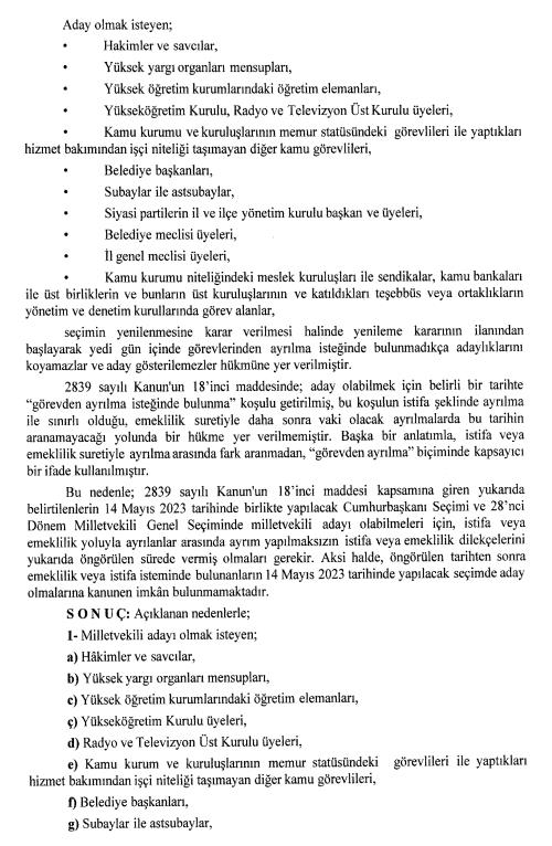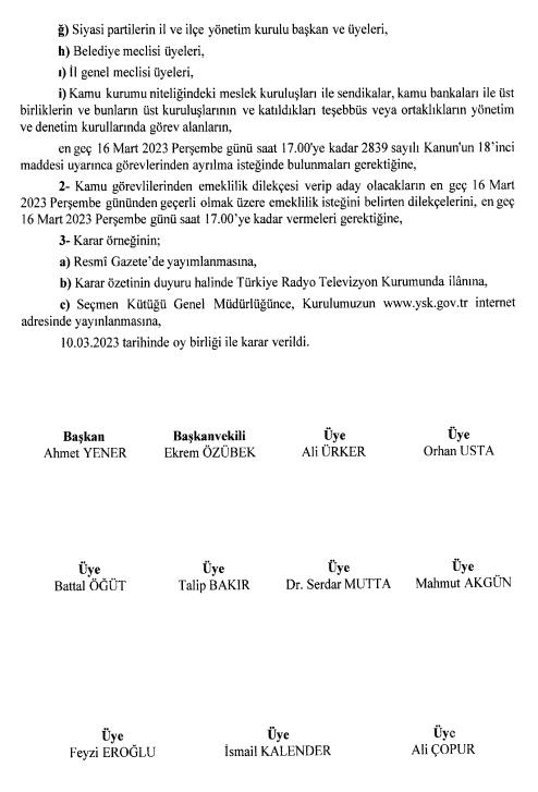 Ayrıca kararda, kamu görevlilerinden emeklilik dilekçesi verip aday olacakların da emeklilik dilekçelerini aynı tarihte sunabilecekleri belirtildi.