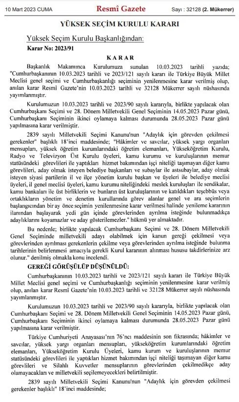 Yüksek Seçim Kurulu'nun (YSK), Cumhurbaşkanı Seçimi ve 28. Dönem Milletvekili Genel Seçimi'nin 14 Mayıs'ta yapılmasına, milletvekili adayı olmak isteyenlerin görevlerinden çekilme tarihine yönelik kararları, Resmi Gazete'nin mükerrer sayısında yayımlandı.