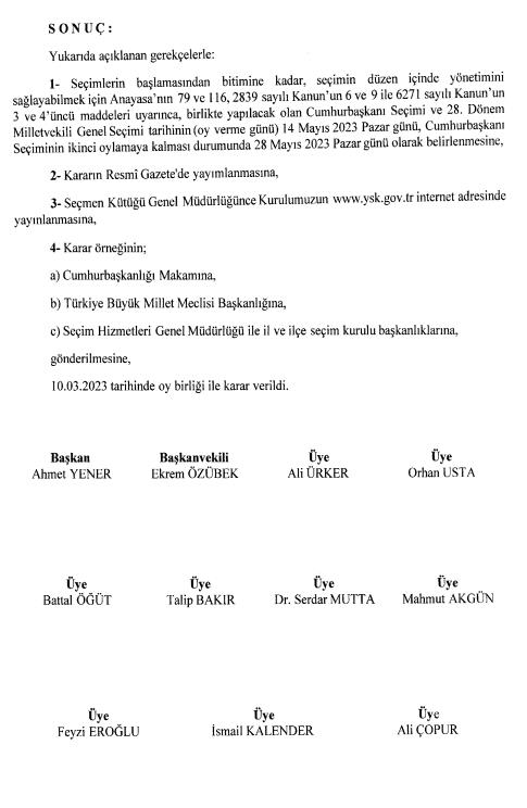 YSK'nin kararında, Anayasa'nın, Cumhurbaşkanı Seçimi Kanunu'nun ve Milletvekili Seçimi Kanunu'nun ilgili maddelerine yer verilerek, birlikte yapılacak Cumhurbaşkanı Seçimi ile 28. Dönem Milletvekili Genel Seçimi tarihinin 14 Mayıs Pazar günü, Cumhurbaşkanı Seçimi'nin ikinci oylamaya kalması durumunda bu seçimin tarihinin 28 Mayıs Pazar günü olarak belirlenmesine hükmedildiği aktarıldı.