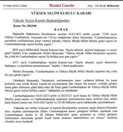 Başkan Recep Tayyip Erdoğan'ın 8 Haziran 2023'te yapılması gereken seçimlerin 14 Mayıs'ta yenilenmesi kararını imzalamasının ardından söz konusu karar, Resmi Gazete'nin mükerrer sayısında yayımlandı. Cumhurbaşkanı Kararı'nda "Türkiye Cumhuriyeti Anayasası'nın 116'ncı maddesi uyarınca Türkiye Büyük Millet Meclisi genel seçimi ve Cumhurbaşkanlığı seçiminin yenilenmesine karar verilmiştir." ifadesine yer verildi.