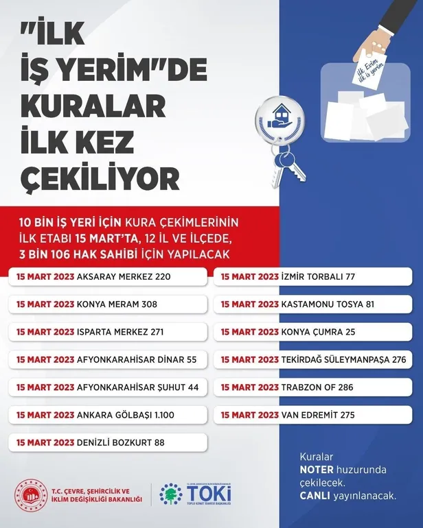 Bakan Murat Kurum, resmî sosyal medya hesabından, yaptığı açıklamayla "İlk İş Yerim" projesi kapsamında 10 bin iş yeri için kura çekimlerine başlandığını duyurdu. Bakan Kurum, yayımladığı mesajında "250 alt sektörü harekete geçiren "İlk Evim, İlk İş Yerim" projemizle istihdamı destekliyor, vatandaşımızı iş sahibi de yapıyoruz. Konut ve arsa kuralarımız devam ederken sıra iş yerlerine geldi. 12 ilde, 3 bin 106 iş yeri için 15 Mart'ta kuraları çekmeye başlıyoruz." dedi.