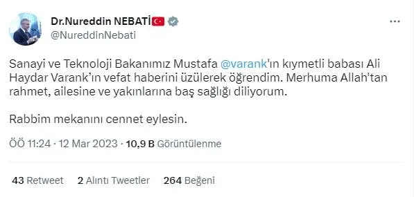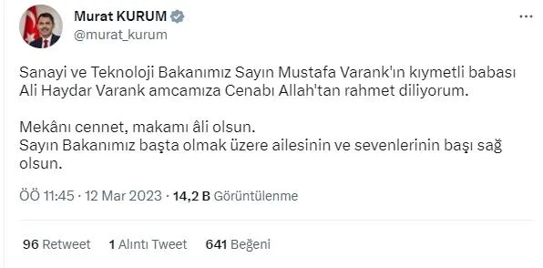 "Sanayi ve Teknoloji Bakanımız Sayın Varank'ın babası Ali Haydar Varank'ın vefatını derin bir üzüntüyle öğrendim. Merhuma Allah'tan rahmet, ailesi ve sevenlerine başsağlığı diliyorum. Mekânı cennet olsun." dedi.