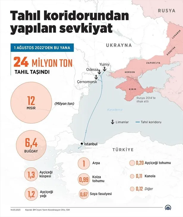 Bugüne kadar Ukrayna limanlarından 24 milyon ton tahılın ihtiyacı olan ülkelere emniyetle sevkinin sağlandığı belirtilen açıklamada, 13 Mart'ta BM koordinatörlüğünde Cenevre'de; BM, Rusya Federasyonu ve Ukrayna heyetleri arasındaki görüşmelerde Rusya tarafından, anlaşmanın 60 gün süreyle uzatılmasına destek verileceği, Rusya'nın, gıda ürünleri ve gübresinin uluslararası pazarlara ihracının kolaylaştırılması konusunda yeterli ilerleme sağlanması halinde anlaşmanın devamından yana olduklarının açıklandığı bildirildi.