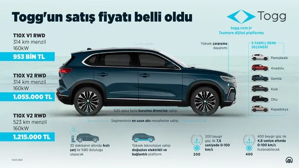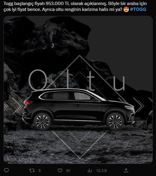 Togg başlangıç fiyatı 953.000 TL olarak açıklanmış. Böyle bir araba için çok iyi fiyat bence. Ayrıca oltu renginin karizma halis mi ya?
