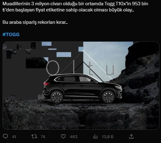 "Muadillerinin 3 milyon civarı olduğu bir ortamda Togg T10x'in 953 bin ₺'den başlayan fiyat etiketine sahip olacak olması büyük olay..