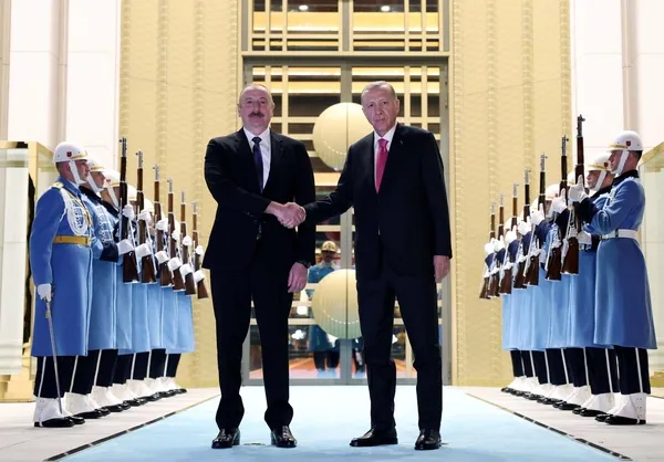 Aliyev'i, Cumhurbaşkanlığı Külliyesi'ne gelişinde Başkan Erdoğan karşıladı.