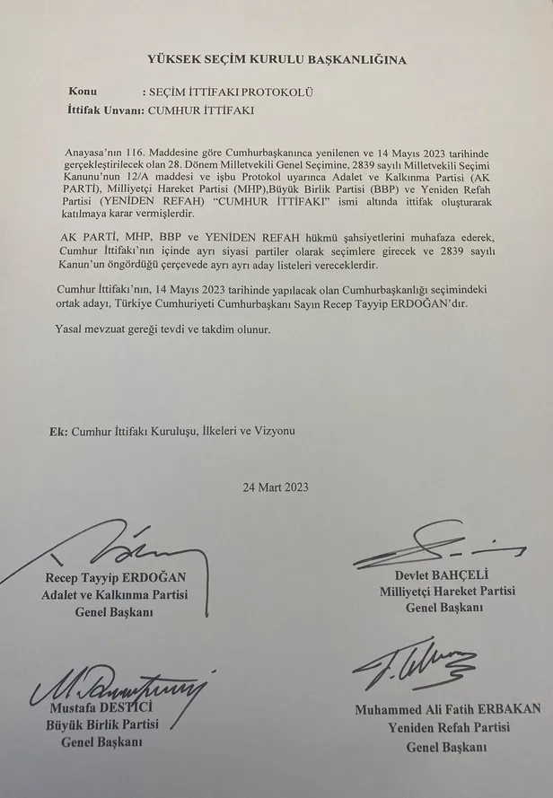 AK Parti, MHP, BBP ve Yeniden Refah'ın hükmü şahsiyetlerini muhafaza ederek "Cumhur İttifakı"nın içinde ayrı siyasi partiler olarak seçimlere gireceği ve 2839 sayılı Kanun'un öngördüğü çerçevede ayrı ayrı aday listeleri verecekleri kaydedilen protokolde, "Cumhur İttifakı"nın 14 Mayıs 2023'te yapılacak Cumhurbaşkanlığı seçimindeki ortak adayının, Başkan Recep Tayyip Erdoğan olduğu ifade edildi.