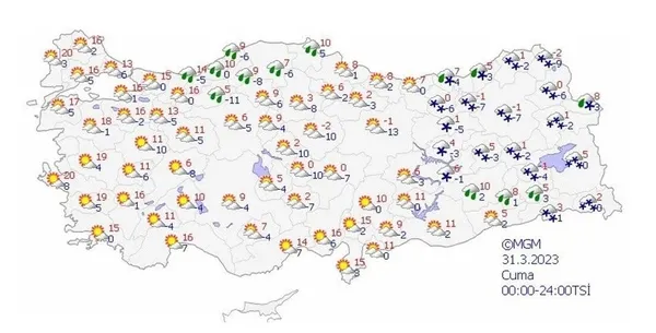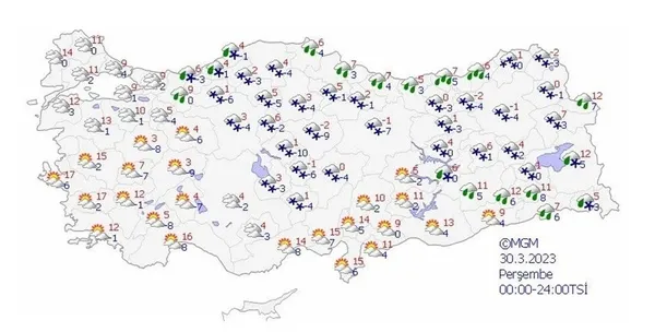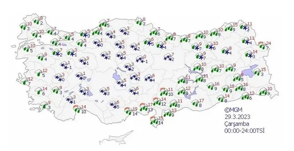 Meteoroloji'den alınan bilgilere göre; hava sıcaklıklarının ülke genelinde hissedilir derecede (8-15 derece) azalarak mevsim normalleri altına düşeceği tahmin ediliyor. Sıcaklık düşüşüyle birlikte yer yer sağanak, kar yağışı ve şiddetli rüzgarlar da görülecek. Meteoroloji, 56 il için sarı ve turuncu kodlu uyarıda bulundu. Öte yandan İstanbul'da Anadolu Yakası'nda Kartal Aydos Ormanı'nın yüksek kesimlerinde beyaz örtü oluşturan kar, Beykoz ve Ümraniye'de aralıklarla sulu kar şeklinde etkisini sürdürüyor. Avrupa Yakası'nda Çatalca, Büyükçekmece, Arnavutköy ve Başakşehir'in yüksek kesimlerinde de kar yağışı etkili oluyor. Ankara'da da sabah saatlerinde bölgesel olarak etkisini gösteren kar yağış kimi noktalarda zaman zaman şiddetleniyor.