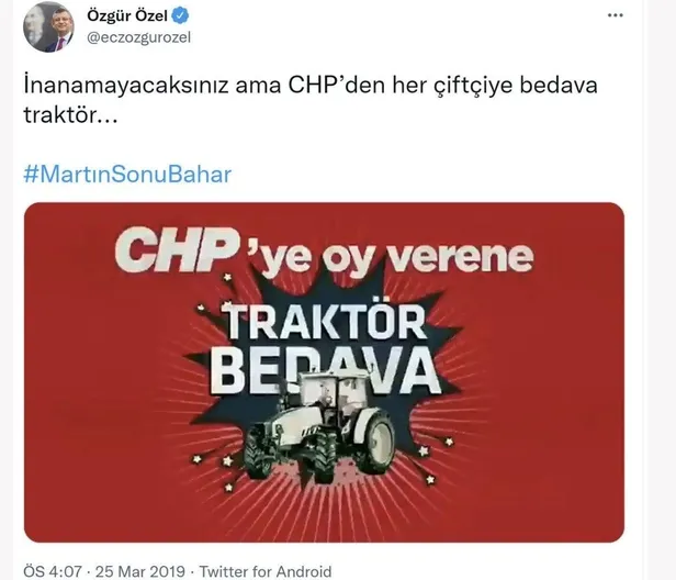Kılıçdaroğlu'nun söylemi akıllara, Özel'in 2019 yerel seçiminde "CHP'ye oy verene bedava traktör" paylaşımını getirdi. Özel seçim sonrası, paylaşımına ilişkin "Çarpıcı olsun diye yazdık" demişti.
