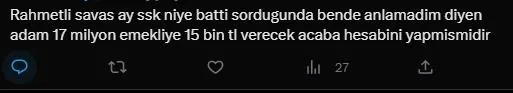Kılıçdaroğlu'na sosyal medyadan tepki gösteren vatandaşlar, "SKK'nın nasıl battığı şimdi belli oldu", "Rahmetli Savaş Ay SSK niye battı diye sorduğunda ben de anlamadım diyen adam 17 milyon emekliye 15 bin TL verecek acaba hesabını yapmış mıdır" yorumlarında bulundu.