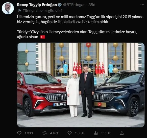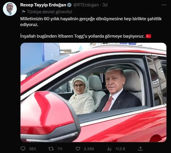 TOGG'un teslim töreni sonrası sosyal medyadan açıklamalarda bulunan Başkan Erdoğan, "Ülkemizin gururu, yerli ve millî markamız Togg'un ilk siparişini 2019 yılında biz vermiştik, bugün de ilk akıllı cihazı biz teslim aldık. Türkiye Yüzyılı'nın ilk meyvelerinden olan Togg, tüm milletimize hayırlı, uğurlu olsun." dedi.