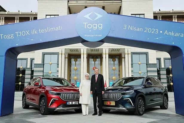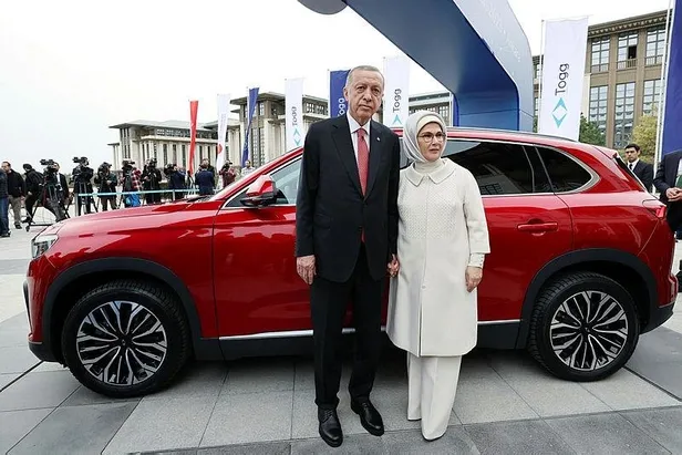 Başkan Erdoğan ve eşi Emine Erdoğan, üzerinde Cumhurbaşkanlığı forsu olan "Gemlik" renkli Togg makam aracı ve Emine Erdoğan'a ait 34 EE 2071 plakalı "Anadolu" renkli Togg'un önünde poz verdi.