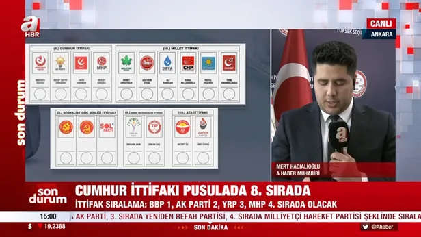 Son dakika haberi... 14 Mayıs seçimlerinde ittifakların ve siyasi partilerin birleşik oy pusulasındaki yerlerinin belirlenmesi için YSK'da çekilen kura sonucunda; Cumhur İttifakı 8. sırada, Emek ve Özgürlük İttifakı 8. sırada, Millet İttifakı 18. sırada, Ata İttifakı ise 19. sırada yer aldı. Cumhur İttifakı içinde BBP 1., AK Parti 2., Yeniden Refah 3. ve MHP 4. sırada seçime girecek.