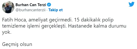 Gazeteci Burhan Can Terzi sosyal medya hesabından "15 dakikalık polip temizleme işlemi gerçekleşti. Hastanede kalma durumu yok. Geçmiş olsun" açıklamasını yaptı.