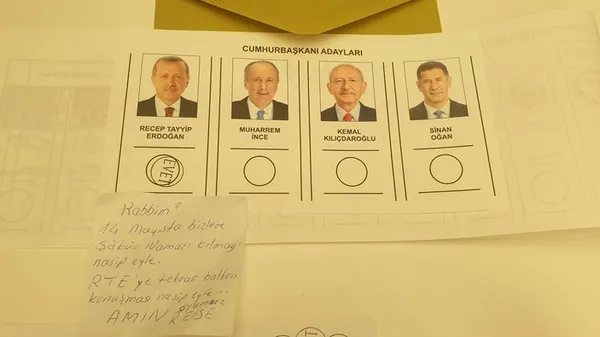 Başkan Recep Tayyip Erdoğan'a oy veren bir vatandaşın, "Rabbim 14 Mayıs'ta bizlere şükür namazı kılmayı nasip eyle. Erdoğan'a takrar balkon konuşması nasip eyle. Oylarımız Reis'e." notu dikkat çekti.
