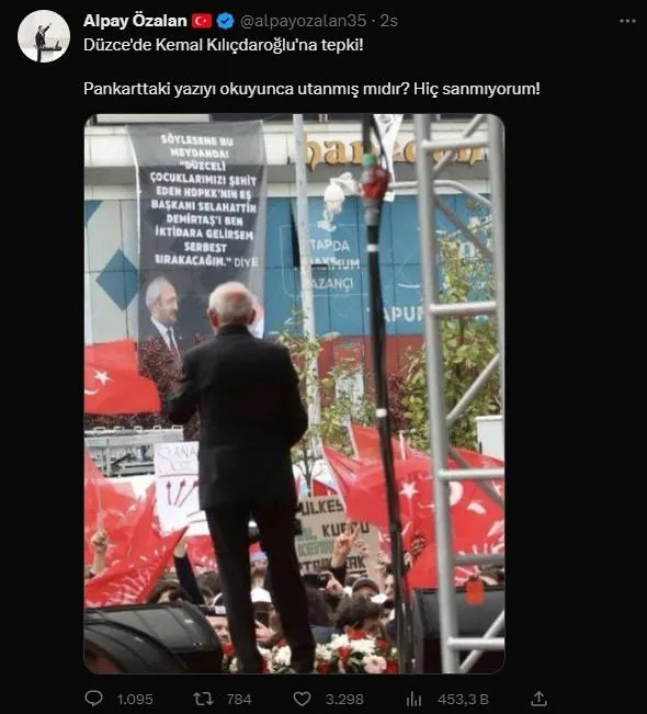 Kılıçdaroğlu'na tepki gösteren AK Parti İzmir Milletvekili Alpay Özalan, sosyal medyadan bir paylaşım yaptı. Özalan paylaşımında, "Düzce'de Kemal Kılıçdaroğlu'na tepki! Pankarttaki yazıyı okuyunca utanmış mıdır? Hiç sanmıyorum!" ifadelerini kullandı.