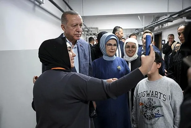 Eşi Emine Erdoğan ile "3279" numaralı sandığın bulunduğu sınıfın önünde sıraya girdi. Sandık görevlileriyle tokalaşan Erdoğan ile Emine Erdoğan, gerekli kontrolün yapılması için kimliklerini sandık görevlilerine verdi.