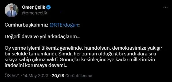 AK Parti Sözcüsü Ömer Çelik, "Cumhurbaşkanımız Değerli dava ve yol arkadaşlarım... Oy verme işlemi ülkemiz genelinde, hamdolsun, demokrasimize yakışır bir şekilde tamamlandı. Şimdi, her zaman olduğu gibi sandıklara sıkı sıkıya sahip çıkma vakti. Sonuçlar kesinleşinceye kadar milletimizin iradesini korumaya devam!.." ifadelerini kullandı.