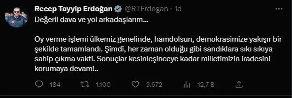 Erdoğan, paylaşımında, "Değerli dava ve yol arkadaşlarım... Oy verme işlemi ülkemiz genelinde, hamdolsun, demokrasimize yakışır bir şekilde tamamlandı. Şimdi, her zaman olduğu gibi sandıklara sıkı sıkıya sahip çıkma vakti. Sonuçlar kesinleşinceye kadar milletimizin iradesini korumaya devam." ifadelerine yer verdi.