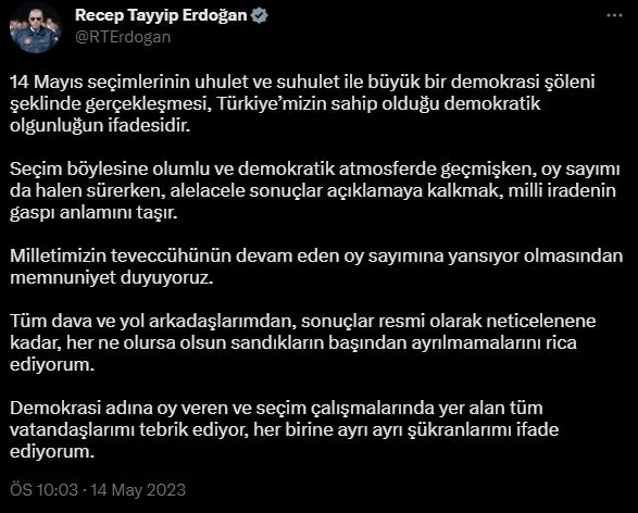 Erdoğan, sosyal medya hesabından yaptığı paylaşımda, 14 Mayıs seçimlerinin uhulet ve suhulet ile büyük bir demokrasi şöleni şeklinde gerçekleşmesinin, Türkiye'nin sahip olduğu demokratik olgunluğun ifadesi olduğunu belirtti.