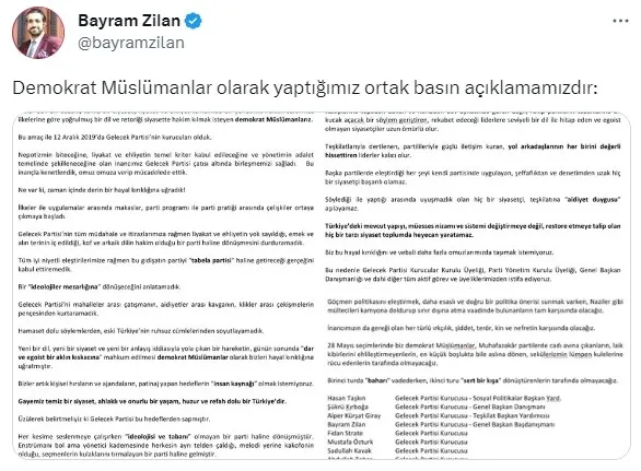 Adil bir düzen, temiz bir siyaset, liyakat ve ehliyet temelinde bir yönetimi benimseyerek parti kuruluşumda yer aldıklarını aktararak istifa eden grup adına açıklamalarda bulunan Bayram Zilan, "Bizler hakkın sarsılmaz ilkelerine göre yoğurulmuş bir dil ve retoriği siyasette hakim kılmak isteyen demokrat Müslümanlarız. Bu amaç ile 12 Aralık 2019'da Gelecek Partisi'nin kurucuları olduk. Nepotizmin biteceğine, liyakat ve ehliyetin temel kriter kabul edileceğine ve yönetimin adalet temelinde şekilleneceğine olan inancımız Gelecek Partisi çatısı altında birleşmemizi sağladı. Bu inançla kenetlendik, omuz omuza verip mücadelede ettik.