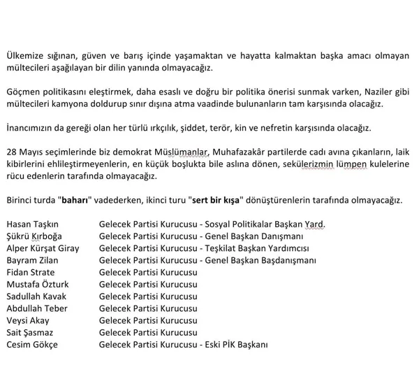 "Bizler göçmen karşıtlığını insan onurunu ayaklar altına alacak bir kıvamda savunanların tarafında olmayacağız. Ülkemize sığınan, güven ve barış içinde yasamaktan ve hayatta kalmaktan başka amacı olmayan mültecileri aşağılayan bir dilin yanında olmayacağız. Göçmen politikasını eleştirmek, daha esaslı ve doğru bir politika önerisi sunmak varken, Naziler gibi mültecileri kamyona doldurup sınır dışına atma vaadinde bulunanların tam karşısında olacağız. İnancımızın da gereği olan her türlü ırkçılık, şiddet, terör, kin ve nefretin karşısında olacağız. 28 Mayıs seçimlerinde biz demokrat Müslümanlar, Muhafazakar partilerde cadı avına çıkanların, laik kibirlerini, en küçük boşlukta bile aslına dönen, sekülerizmin lümpen kulelerine rücu edenlerin tarafında olmayacağız. Birinci turda "bahar" vadederken, ikinci turu "sert bir kışa" dönüştürenlerin tarafında olmayacağız."
