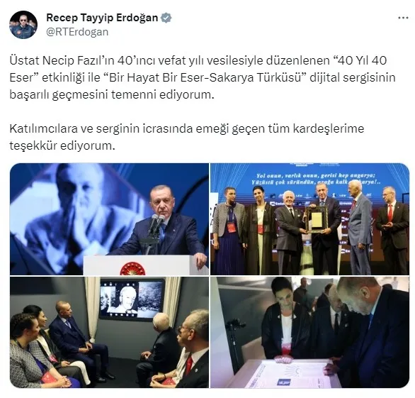 Başkan Recep Tayyip Erdoğan resmi sosyal medya hesaplarından, "Üstat Necip Fazıl'ın 40'ıncı vefat yılı vesilesiyle düzenlenen "40 Yıl 40 Eser" etkinliği ile "Bir Hayat Bir Eser-Sakarya Türküsü" dijital sergisinin başarılı geçmesini temenni ediyorum. Katılımcılara ve serginin icrasında emeği geçen tüm kardeşlerime teşekkür ediyorum." ifadeleriyle bir paylaşımda bulundu.