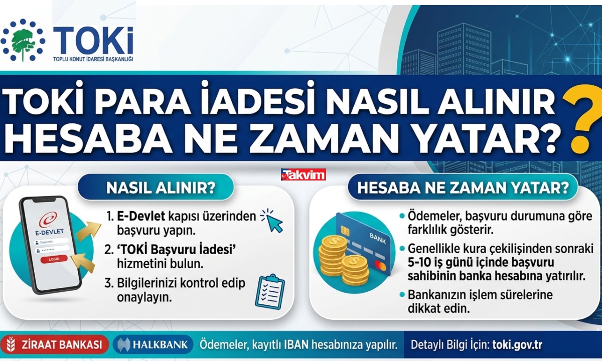 İade sürecinde bazı önemli detaylar bulunuyor: Ödeme yapılacak IBAN, başvuru sahibine ait olmalı. Başka bir kişinin hesabına ödeme yapılmıyor. Yatırılan 5 bin TL ise herhangi bir kesinti olmadan iade ediliyor. Vatandaşların süreci sorunsuz takip edebilmesi için hem TOKİ'nin resmi duyurularını hem de ilgili bankaların bilgilendirmelerini düzenli olarak kontrol etmesi öneriliyor.