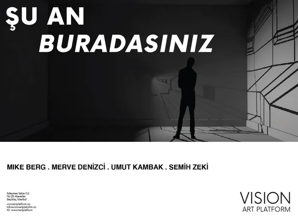 'Şu An Buradasınız' 24 Eylül Cuma günü Vision Art Platform'da açılıyor. Sergi, farklı tekniklerle çalışan 4 sanatçının eserlerini bir araya getiriyor. Mike Berg, Merve Denizci, Umut Kambak ve Semih Zeki'nin katıldığı Şu An Buradasınız'ın metnini küratör ve sanat yazarı Sinan Eren Erk yazdı.