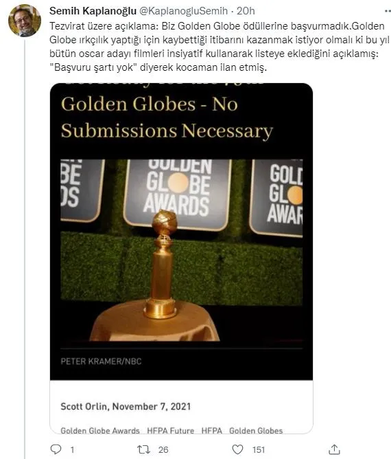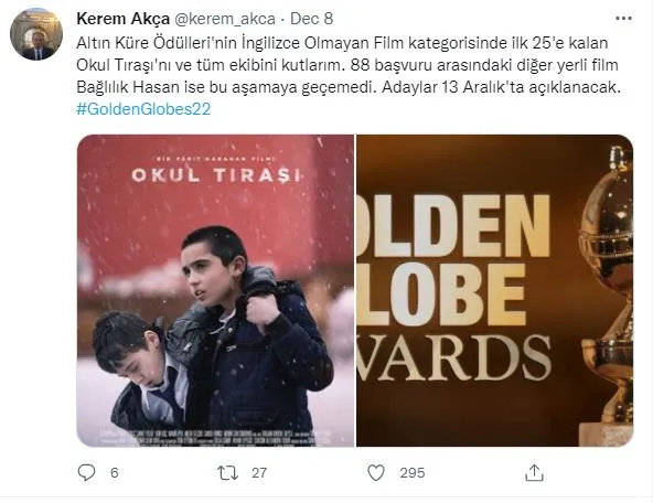 Akça, 'Altın Küre Ödülleri'nin İngilizce Olmayan Film kategorisinde ilk 25'e kalan Okul Tıraşı'nı ve tüm ekibini kutlarım. 88 başvuru arasındaki diğer yerli film 'Bağlılık Hasan' ise bu aşamayı geçemedi. Adaylar 13 Aralık'ta açıklanacak' diye yazınca Kaplanoğlu'nun yanıtı sert oldu.
