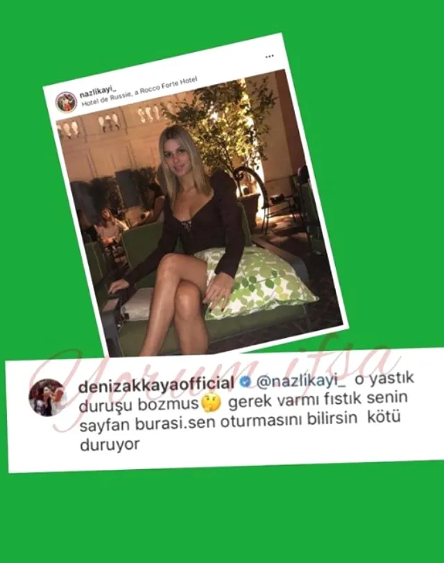 Geçtiğimiz sene aşk yaşamaya başlayan Hacı Sabancı ve Zeynep Nazlı Kayı çifti hafta sonunda İtalyaRoma'ya gitti. Zeynep Nazlı Kayı'nın Instagram'da paylaştığı yastıklı fotoğraf olay oldu. Deniz Akkaya'nın bu poza yorum yapıp "O yastık duruşu bozmuş. Gerek var mı fıstık? Sen oturmasını bilirsin, kötü duruyor" yazması ise adeta ortalığı karıştırdı. Akkaya'nın yorumu üzerine pek çok kullanıcı Kayı'nın fotoğrafına kötü yorum yağdırdı.