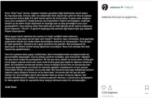 Konu 'Arda Turan' olunca, magazin medyası gerçekleri değil dedikoduları tercih ediyor. Bu hep böyle oldu. Ama bu defa, her defasından farklı olarak beni çirkin bir iftira ile sadece kamuoyunun önüne değil, 8,5 aylık hamile eşimin de önüne attılar. O gece neler olduğunu uzun uzun anlatabilirim. Orada bulunan hanımefendilerin hiçbirini tanımadığımı, hiçbiriyle kendimi ya da ailemi küçük düşürecek bir diyaloğa asla ve asla girmediğimi uzun uzun açıklayabilirim.