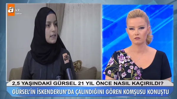 Müge Anlı 25 Ekim günü yine şok gerçeklerin ortaya çıkmasında ışık oldu. Atv'nin sevilen ve güvenilen programı Müge Anlı ile Tatlı Sert'te bugün neler yaşandı? 21 yıl önce anne ve babasından kaçırılıp başka aileye verilen Gürsel Selam ile ilgili yeni gelişmeler yaşandı. Gürsel Selam'ı kim, neden kaçırdı? Gürsel Selam'a bakan anne ve baba gerçeği biliyor mu? Müge Anlı'da bugün Gürsel Selam'ın çocukluk arkadaşı o anları gördüğünü anlattı. Peki, Gürsel Selamı kaçıran kişiler kimlerdi? İşte, Müge Anlı canlı yayında 21 yıldır ailesinden uzakta başka bir aileyle yaşayan Gürsel'in kaçırıldığını anı gören görgü tanığı Yasemin Hanım'ın anlattıkları...
