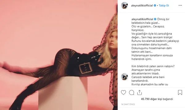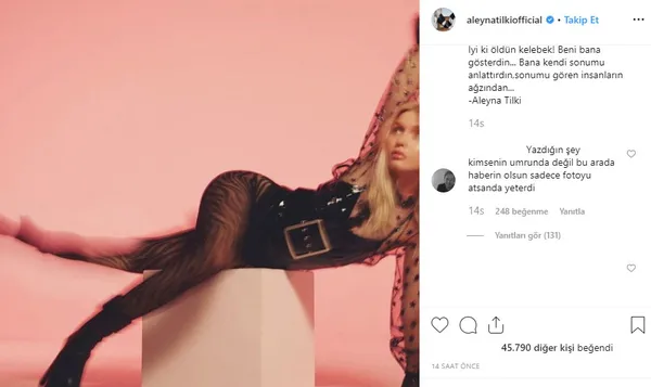 Aleyna Tilki, sosyal medya sayfasından bir şiirini takipçilerinin beğenisine sundu. Kelebek şiirini ilginç fotoğrafıyla paylaşan Aleyna Tilki sosyal medyada gündem oldu. Aleyna'nın paylaşımına yorum yapan bir takipçisi, "Ben şiiri çok beğendim" dedi. Başka bir takipçisi ise, "Şiire gerek yoktu aslında. Sadece fotoğraf atsan yeterdi" yorumunu yaptı.