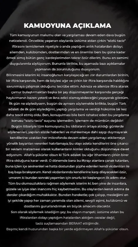 Futbolcu Arda Turan ile şarkıcı Berkay Şahin'in yargılandıkları davanın üçüncü duruşmasında Arda Turan cinsel taciz suçundan beraat etti. Duruşmaya ilk gelen Berkay oldu. Ünlü şarkıcı yaptığı açıklamada ‘Ben davamın arkasındayım’ dedi. Turan'a kasten yaralama ve ruhsatsız silah suçundan ceza verildi.