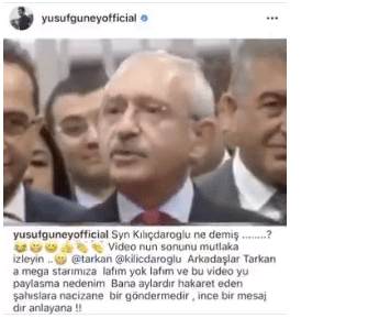 Sosyal medya hesabından bir video paylaşan Yusuf Güney, Tarkan'ın başkanlara sarf ettiği cümleleri, Kemal Kılıçdaroğlu'nun "Yalakadan sanatçı olmaz" dediği sözlerle birleştirerek paylaştı. Güney, paylaşımın altına şu sözleri de ekledi;