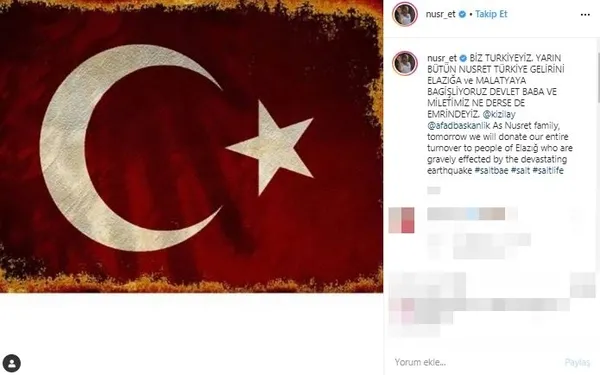 Elazığ depremi için Türkiye tek yürek oldu. Acun Ilıcalı'dan sonra ünlülerin et ustası Nusret Gökçe de yardım kampanyalarına destek oldu. Türkiye genelinde büyük yardım kampanyaları başlatılırken, ünlü isimler de deprem bölgesine yardım gönderiyor. Salt bae hareketiyle tüm dünyada tanınan işletmeci Nusret Gökçe de Elazığ ve Malatya'daki depremzedeler için elini taşın altına koyarak Instagram hesabından yardımda bulacağını söyledi. Aktif olarak kullandığı sosyal medya hesabı Instagram'dan paylaşım yapan Gökçe,"Biz Türkiye'yiz. Yarın bütün Nusret Türkiye gelirini Elazığ'a bağışlıyoruz. Devlet baba ve milletimiz ne derse emrindeyiz" dedi. Gökçe'nin bu anlamlı paylaşımına kısa sürede binlerce beğeni geldi.