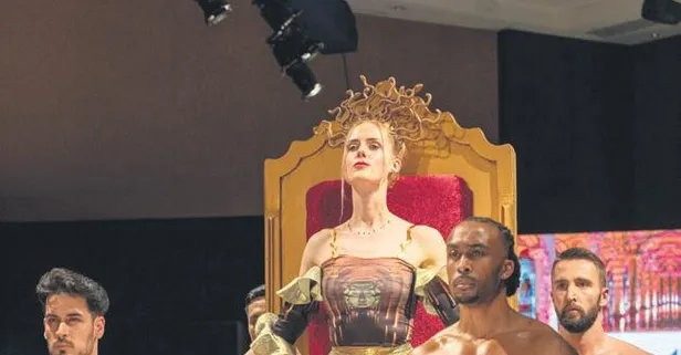 Ünlü oyuncu Wilma Elles, Londra Moda Haftası'nda başarılı Türk tasarımcı Emre Tamer'in koleksiyonundan bir parçayı taht üzerinde taşıdı.