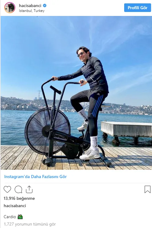 Açık havada bisiklet ile kardio yapan Sabancı, Instagram'dan da paylaşım yapmayı ihmal etmedi. Ancak fotoğrafın dışarıda çekilmesine tepki gösteren bir takipçisi, "İnanamıyorum size. Devlet dışarı çıkmayın diyor, siz dışarıdasınız spor bahanesiyle. "Pes yani" dedi.