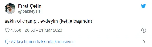 Hacı Sabancı'nın bu yanıtı, sosyal medyada gündem oldu. Twitter'da sosyal medya kullanıcılarının kendi evlerinden çektikleri fotoğraflarının yer aldığı "Sakin ol şampiyon, evdeyim" paylaşımları yapıldı.