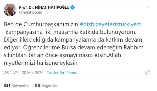 Nihat Hatipoğlu, Başkan Recep Tayyip Erdoğan'ın ulusa sesleniş konuşmasında başlattığı, 'Milli Dayanışma Kampanyası'na destek oldu.'Biz Bize Yeteriz Türkiyem' diyen Hatipoğlu, kişisel sosyal medya hesabından yaptığı açıklamada, "Ben de Cumhurbaşkanımızın Biz Bize Yeteriz Türkiye'm kampanyasına iki maaşımla katkıda bulunuyorum. Diğer illerdeki gıda kampanyalarına da katkım devam ediyor. Öğrencilerime bursa devam edeceğim. Rabbim sıkıntıları bir an önce aşmayı nasip etsin. Allah niyetlerimizi halisane eylesin" ifadelerini kullandı.