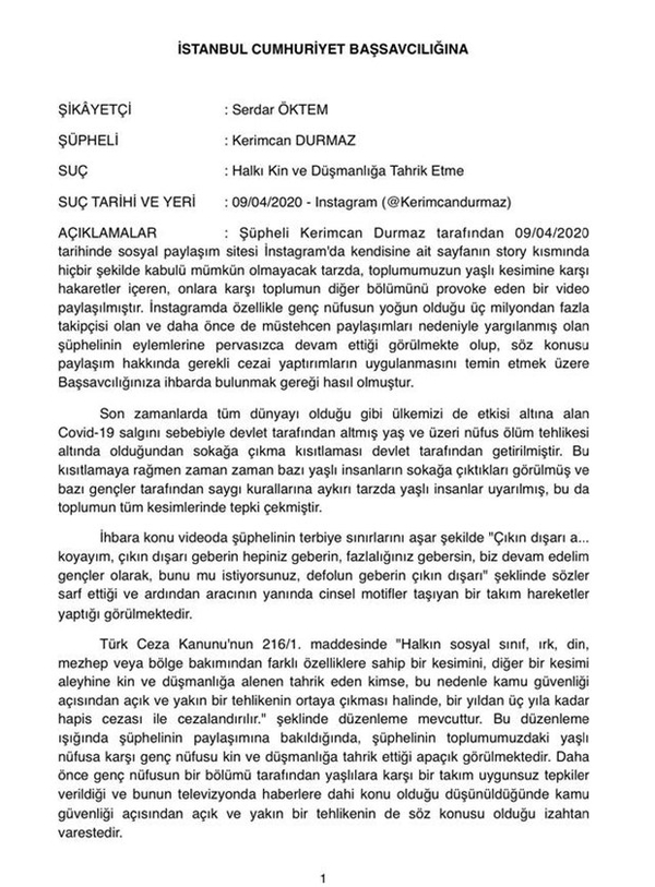 Sözde fenomen Kerimcan Durmaz'ın skandal sözleri cezasız kalmayacak. Avukat Serdar Öktem, Kerimcan Durmaz'ın Instagram paylaşımı nedeniyle "Halkı kin ve düşmanlığa tahrik etme" suçundan İstanbul Cumhuriyet Başsavcılığı'na suç duyurusunda bulundu. Öktem suç duyurusunda, şüpheli Kerimcan Durmaz tarafından 09 Nisan 2020 tarihinde sosyal paylaşım sitesi Instagram'da kendisine ait sayfanın story kısmında hiçbir şekilde kabulü mümkün olmayacak tarzda, toplumumuzun yaşlı kesimine karşı hakaretler içeren, onlara karşı toplumumuzun yaşlı kesimine karşı hakaretler içeren, onlara karşı toplumun diğer bölümünü provoke eden bir video paylaşıldığını belirtti.