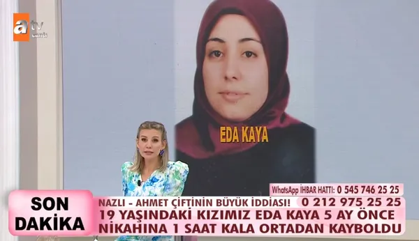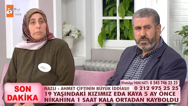 Nazlı - Ahmet çifti, "19 yaşındaki kızımız Eda Kaya 5 ay önce nikahına 1 saat kala ortadan kayboldu" iddiasıyla Esra Erol'dan yardım istedi. Nikahına 1 saat kala aniden ortadan kaybolan Eda Kaya en son kiminle görüştü?