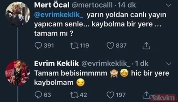 İkilinin Instagram'dan yaptığı yorumlaşmanın yankıları sürerken bir bomba da Twitter'dan geldi. Mert Öcal'ın "Yarın yoldan canlı yayın yapacağım seninle. Bir yere kaybolma." mesajına Evrim, 'bebişim' hitabıyla cevap verdi. Keklik, "Tamam bebişim. Hiçbir yere kaybolmam" dedi. Evrim ve Mert'in Survivor birleşme partisinde sohbet ettiği anlar da günlerce konuşulmuş, ikilinin birbirlerine bakışları da dikkatlerden kaçmamıştı.